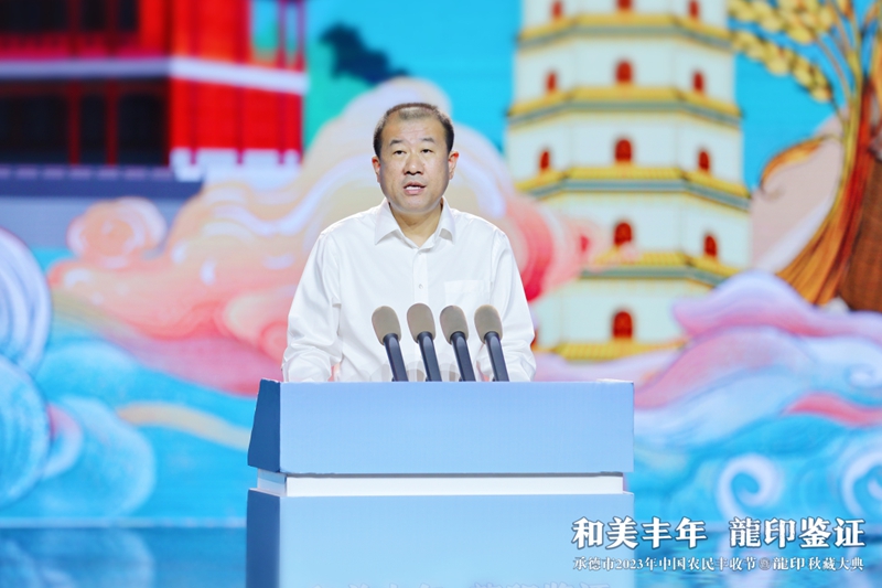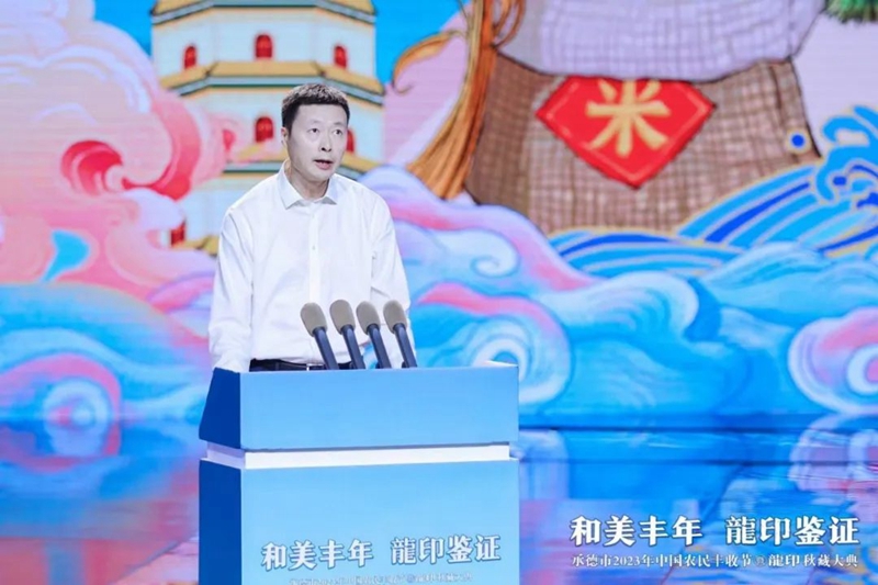 整場慶典以記錄承德人民美好生活、美景美食、農業(yè)碩果的視頻《承德十二時辰》拉開帷幕。承德市人民政府副市長崔萬峰率先上臺致辭,并對承德市2023年中國農民豐收節(jié)暨龍印秋藏大典的召開表示熱烈祝賀。