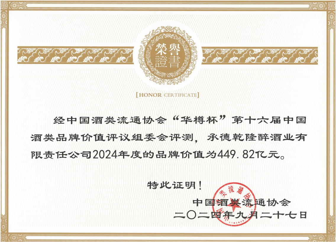 板城酒業(yè)憑借過硬的綜合實力得到行業(yè)肯定及評審專家的認可,經中國酒類流通協會“華樽杯”第十六屆中國酒類品牌價值評議組委會評測,承德乾隆醉酒業(yè)有限責任公司(板城酒業(yè))2024年度的品牌價值為449.82億元,中國白酒行業(yè)排名三十位,同時,榮獲“2024年度華樽杯中國濃香白酒十大匠心品質品牌”、“2024年度華樽杯中國文化傳承典范白酒品牌”獎項,充分彰顯了冀酒的品質自信,也傳遞出行業(yè)、社會對板城酒業(yè)品牌文化的高度認可。
