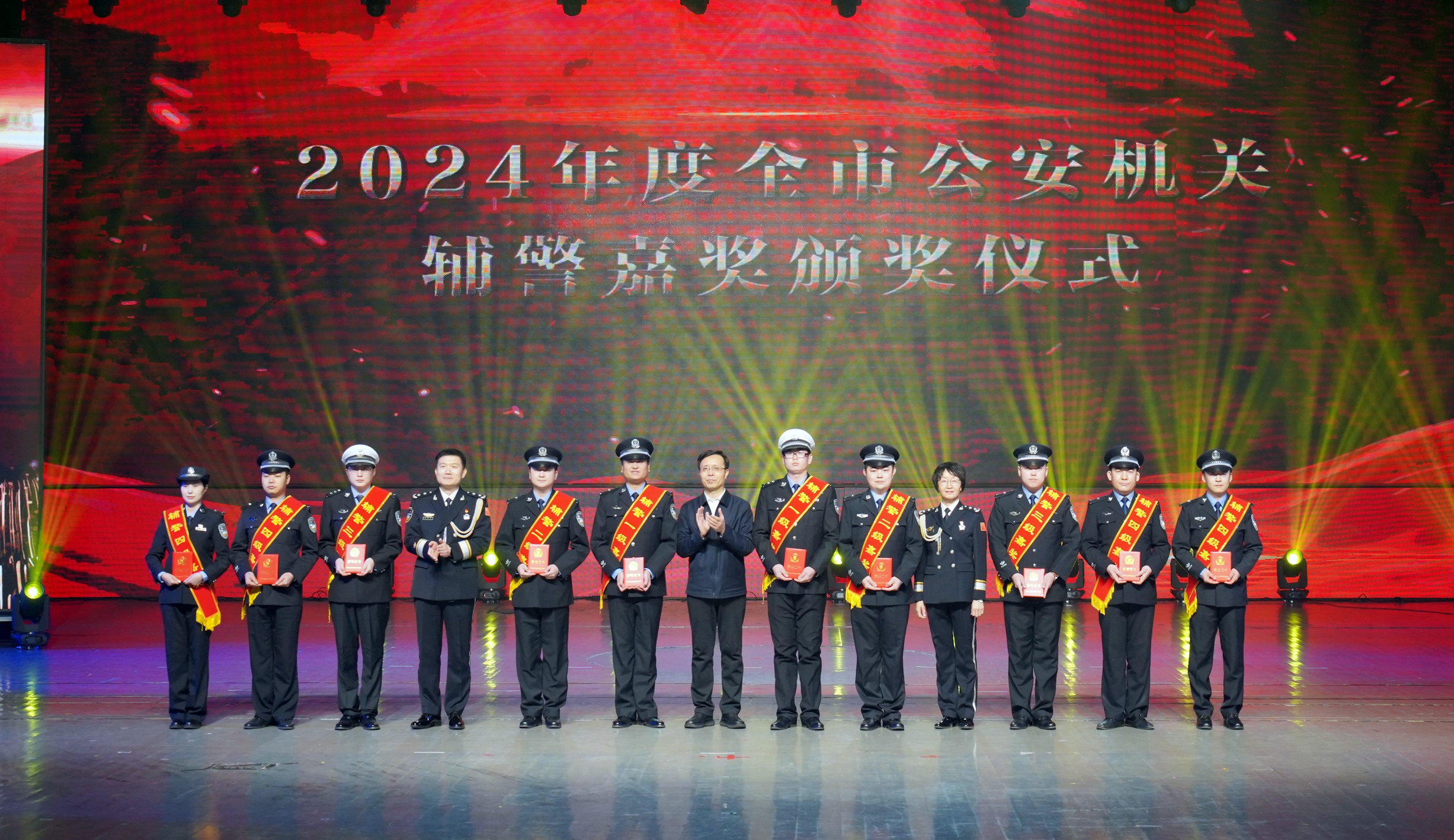 市委常委、政法委書(shū)記李曉波,省公安廳二級(jí)巡視員賈永華,市政府副市長(zhǎng)、市公安局黨委書(shū)記、局長(zhǎng)康海潮為輔警嘉獎(jiǎng)代表頒獎(jiǎng)