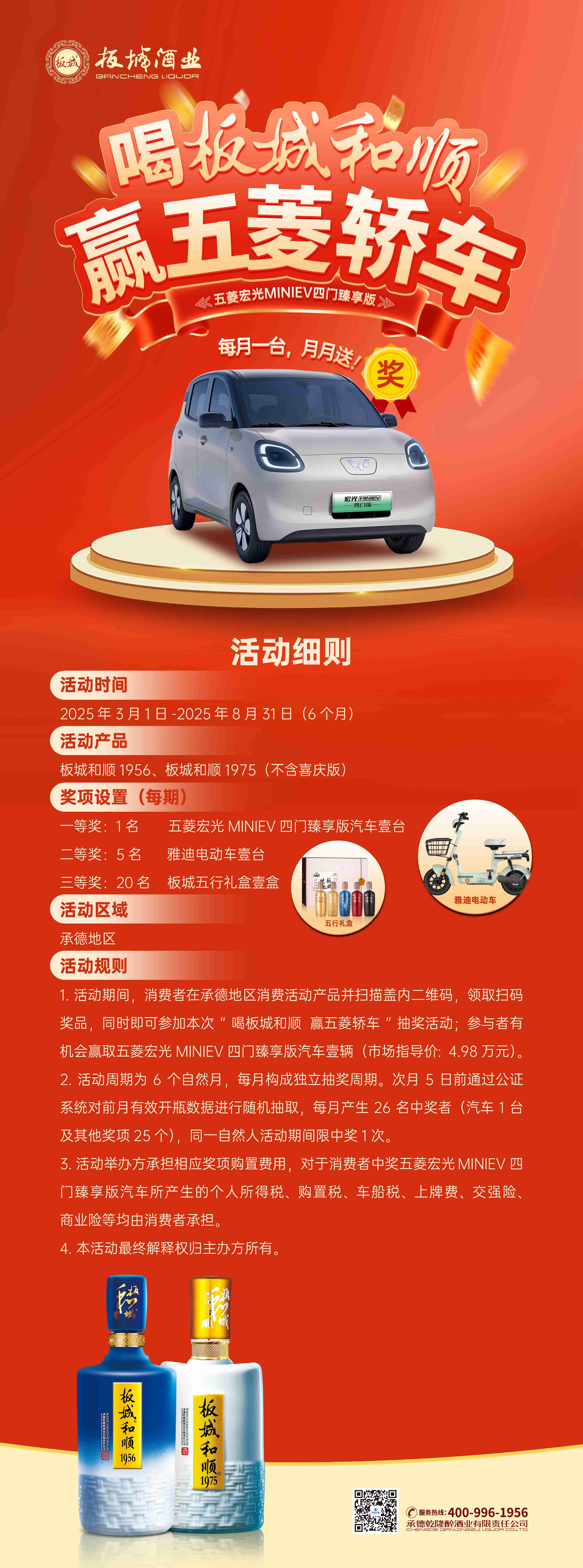 消費者在承德區(qū)域購買板城和順1975、板城和順1956(不含喜慶版)產(chǎn)品后,掃描瓶蓋內(nèi)二維碼,即可自動參與抽獎。掃碼用戶除享受原有掃碼獎勵外,還可額外獲得贏取五菱宏光MINIEV四門臻享版汽車、雅迪電動車等重磅獎品的機會。