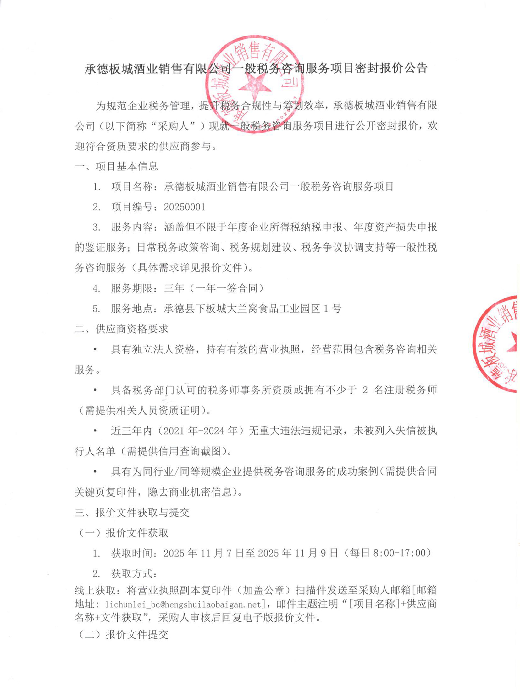 承德板城酒業(yè)銷售有限公司一般稅務咨詢服務項目密封報價公告